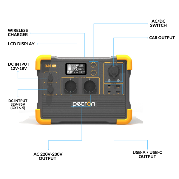 Además de las salidas de corriente alterna, la Pecron E600LFP integra puertos para todos tus dispositivos: 4 USB-A, 1 USB-C (carga rápida según dispositivo) y una superficie de carga inalámbrica en la parte superior.